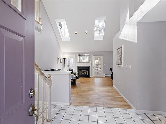 Welcome to this beautifully maintained 3-bedroom, 2.5-bathroom free-standing condo in Bedford's desirable Huckins Farm community. This inviting home opens to a generous light-filled living room, boasting 16'10" ceilings accented by skylights. The living space connects to a classically designed kitchen, complete with a cozy breakfast nook for casual dining. The separate dining area is ideal for entertaining or formal meals. The spacious first-floor primary suite offers the convenience of one-level living, while the 2 upstairs bedrooms provide flexible living options for guests, a home office, or hobby space. Enjoy wooded tranquility on the charming sunroom and private patio, ideal for morning coffee or relaxing evenings. As a resident of Huckins Farm, you'll have access to exceptional recreational facilities including a swimming pool, tennis and pickleball courts, walking trails, and more!