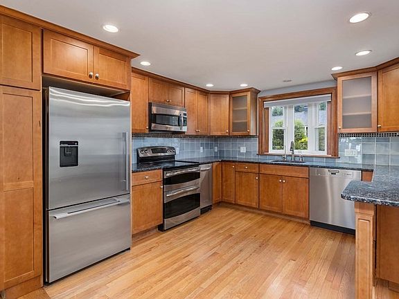 Set in a fantastic location, this expansive eight room Ranch-style house is within .8 miles to Needham Center commuter rail station, shops, cafés, and restaurants. With over 2,100 square feet of living space, there are four bedrooms, two and one-half bathrooms, an updated kitchen with granite countertops and stainless steel appliances, a dining room with built-in china cabinet, and a large family with a cathedral ceiling and skylight. Additional features include a lovely sunroom, central air-conditioning, abundant sunlight, first floor laundry, and two-car garage under the house. A wonderful opportunity for developer and/or end user and convenient to all Needham has to offer.