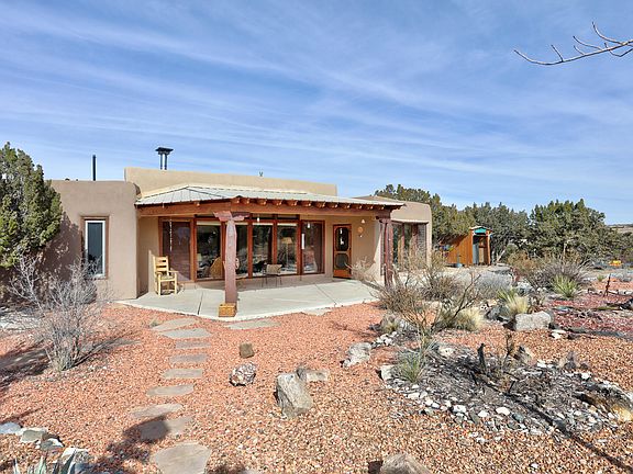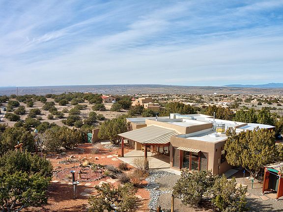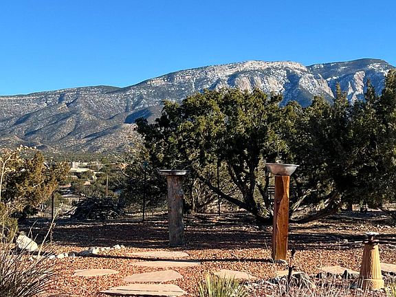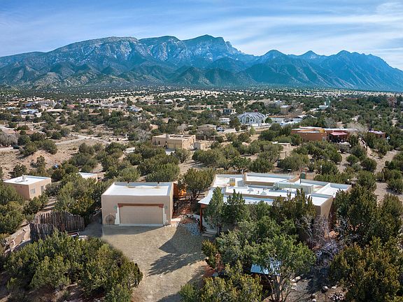 Classic adobe/frame home - rich vigas, wood beams, traditional brick floors. Large entry foyer. Living room has toasty woodstove plus Sandia views. Spacious kitchen - center island for cooking and gathering. Dining area with impressive morning/evening views. Spacious bedrooms. Terrific baths. Heated/cooled sunroom for home office, den or guest overflow. Delightful covered sitting porches front and back. Central heat, excellent tasting water, underground power. Oversized two car garage with covered outdoor workshop area. Land is professionally landscaped, has extensive terraced gardens w/amended soil, as well as front entry gate. Safe, secure, peaceful, and private. Home sits on top of ridge-top knoll on 1. 5 acres with panoramic views. Adjoining 1.2 acre lot available. Hike, bike, play!