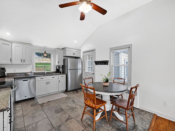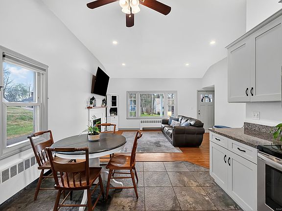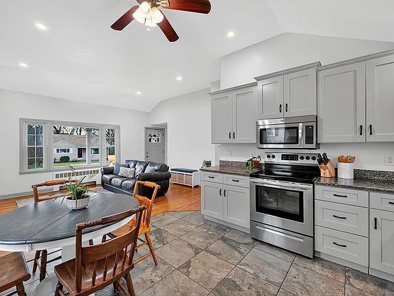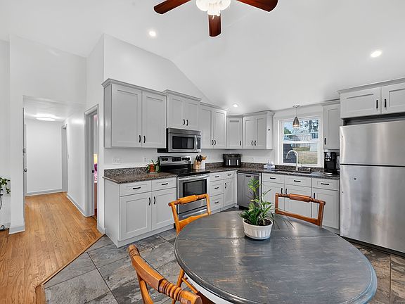 WHAT BETTER GIFT THAN THE GIFT OF HOME!!! An inviting front porch welcomes you to this well-updated Ranch, which features an open floor plan with soaring ceilings in an airy living-dining-kitchen combo accented by a fireplace and large picture window. The kitchen offers granite countertops and stainless-steel appliances, complementing the updated primary bath, with lots of fresh paint and hardwood floors on the main level, where you will also find three bedrooms. A versatile, fully finished lower level nearly doubles the living space, adding a fourth bedroom, second full bath, playroom, office and kitchenette... perhaps an in-law/guest suite or home office/daycare... as well as ample storage and a walk-up/out exit to the fenced back yard. Outside, enjoy a deck, raised garden beds, firepit, sprinklers and a quintessential covered front porch. An attached garage completes this super-sweet home packed with space and amenities, all located on a quiet, residential street.