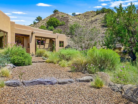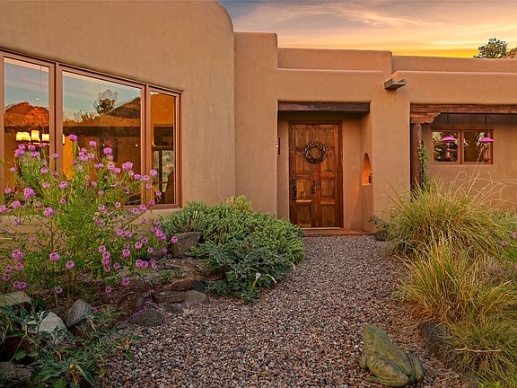 The 4,032 sq ft property combines a 3,059 sq ft residence with a heated garage and storage room, offering an additional 973 sq ft of versatile space. The home blends timeless Southwestern architecture with refined modern finishes, including hand-carved wood doors, artisan detailing, and locally sourced Nambé brick floors that flow throughout. Each room is designed to maximize natural light and frame dramatic vistas. A chef’s kitchen features a Sub-Zero fridge/freezer, Wolf oven, induction cooktop, and custom craftsmanship, while the spa-inspired primary suite offers a deep soaking tub and walk-in shower.