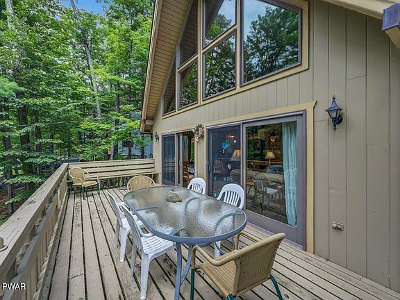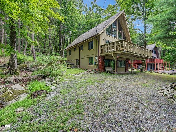 Chalet-style home on a level, second-tier lot directly across from Roamingwood Lake on the peaceful Roamingwood Road in The Hideout--an amenity-filled, four-season community in the beautiful Northern Poconos! Enjoy gorgeous western-facing lake views and stunning sunsets from your front deck. Inside, this spacious home offers three finished levels, an open floor plan, soaring ceilings with knotty pine and real redwood paneling, and a dramatic floor-to-ceiling stone fireplace that anchors the main living space. The lower level features a large recreation room, a third full bathroom, and an attached garage for added convenience. A circular driveway makes access easy, and the location puts you steps from lake activities while enjoying the privacy of a quiet street. A perfect getaway or year-round home in one of the Poconos' most desirable communities!
