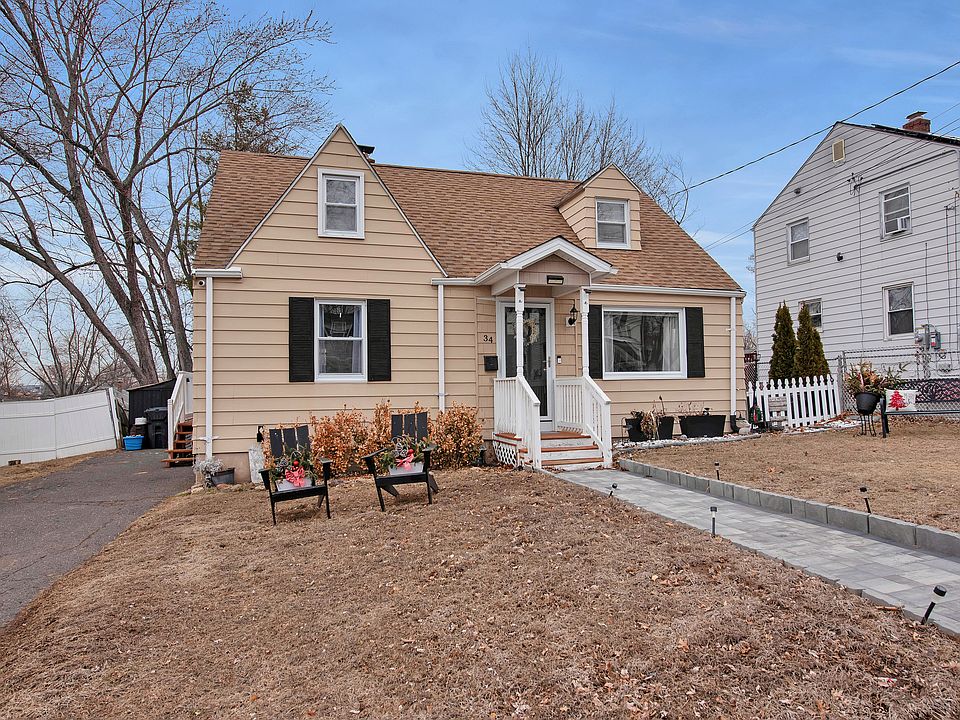 WELCOME HOME to this charming and beautifully maintained Cape. With 3 Bed, 1 Bath, and hardwood floors throughout, this home is the definition of 'Move-in Ready' for any lucky buyer. With a brand new front walkway made of stone, approach the front door and enter the main level of the home that boasts a spacious living room with a large window overlooking the front yard. The lovely Eat-in Kitchen features tiled floors, granite countertops and stainless steel appliances, as well as a breakfast bar to drink your morning coffee. Enjoy the convenience of the Spacious Primary Bedroom and Bathroom being on the main level as well. The upper level has 2 good sized additional bedrooms with dormer windows. The full basement features a brand new water heater (2025), is partially finished w/bar and offers plenty of space for storage with the potential to add additional living area. Enjoy the privacy of a large fenced-in back yard featuring a fire pit and brand new stone patio with a pergola for those nice summer days entertaining family and friends. Conveniently located near highways and shopping centers, this home awaits a lucky new owner. Won't last long. Schedule a tour today. Your future home awaits!!! ------------MULTIPLE OFFERS RECEIVED. SELLER REQUESTING HIGHEST AND BEST BY 5pm MONDAY (3/17/25) This listing contains audio and video surveillance equipment on premises (Ring Camera)