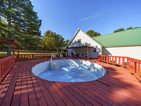 This gorgeous 3 bedroom, 2 bathroom, farmhouse-style home sits on 5 +/- picturesque acres and features a charming wrap-around porch on three sides, perfect for relaxing and taking in the peaceful surroundings. Off one side, you'll find a deck with a swimming pool, offering an ideal space for entertaining or enjoying those hot summer days.