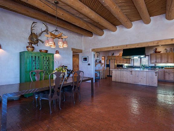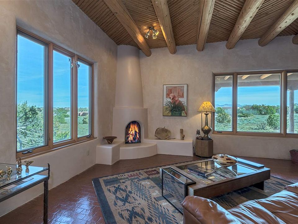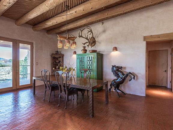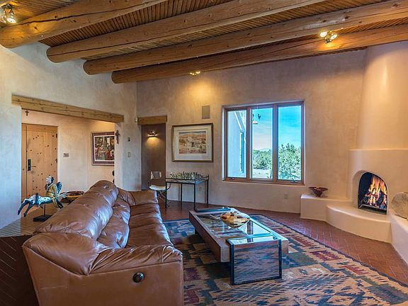 Located in beautiful Ladera at Eldorado, this lovely, all single level open concept design features the very best of rural living with immediate and nearby access to all the impressive amenities this corridor of Santa Fe offers. Built by Jim Hickman in 1997, this secluded custom residence features brick floors with in-floor radiant heat, vigas and latillas, hand plastered walls, fantastic bedroom separation (master on one wing-guest bedrooms on other), two fireplaces, efficient and open cook's kitchen, with Viking stove deep western portal with outdoor kiva, and soulful and expansive mountain views in 2 different directions and 3 car garage. All this bordered on one entire side by State Trust land and overlooking a greenbelt with amazing sunsets to the west, this is an accessible, flexible offering for any buyer looking for true serenity, incredible views and the very best of locations in this desirable community.