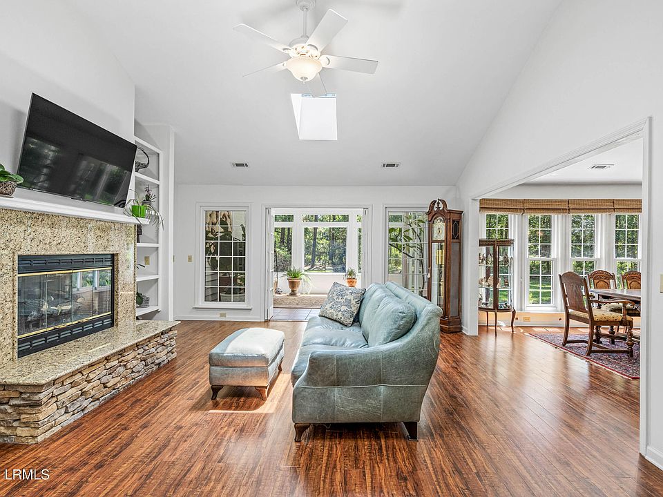 Gas fireplace conversionKoi pond waterfallStylish barn doorFreshly painted ceilingsClean modern lookSerene carolina roomPeaceful street
