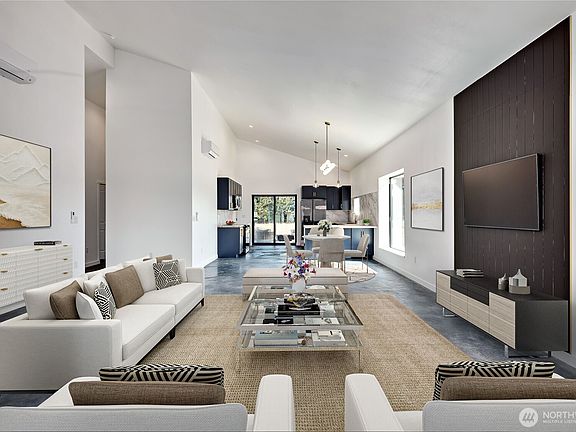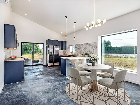 One Story Mountain View home features a brilliant design and loaded with spectacular modern features on level acre property. Insulated concrete form construction, matte black metal roofing and siding, 1800+ finished square feet, covered & heated rear patio. Home features polished concrete floors, stainless Samsung appliances, soft close cabinets, butcher block counters, ductless mini split heating and cooling, vaulted ceilings, hot tub wired, EV charge line, generator ready. Olympic Mountain views, minutes to 2 golf courses and Discovery Trail.