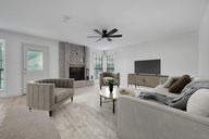 Cozy brick fireplaceLarge backyardComfortable bedroom spacesInviting kitchen layout
