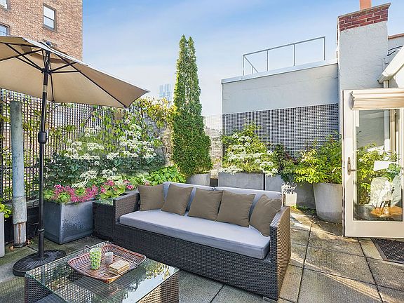 Just off Central Park West on a landmarked block of 1904 Neo-Georgian townhouses, 34 West 74th Street, Apartment 5C is a rare find. This duplex two bedroom, two bathroom penthouse with loft like living/dining room, wood-burning fireplace with a Bianco Borealis marble mantle and 360sf landscaped terrace, is located in a meticulously maintained 13 unit elevator coop. The exquisite and tasteful recent renovations will satisfy even the most discerning purchaser. Take the oversized elevator up to the 5th floor and from the moment you open the front door you'll feel like you're stepping into an apartment in Paris: There is a high end chef's kitchen with Viking stove, Miele dishwasher, Sub-Zero refrigerator, Leicht custom cabinets, GE wine cooler and an LG washer/dryer, two HVAC A/C systems, a beautifully renovated bathroom with Robern top of the line medicine cabinets featuring built-in nightlight and defogger, and a tranquil elegant bedroom or den. Walk up the elegant staircase to the second floor and you are in the light-filled primary bedroom area, with two skylights, a bay window, and glass door looking onto a beautifully landscaped, south-facing patio large enough for gracious entertaining. The second floor also has a full windowed bathroom, two fully outfitted custom closets and a split system A/C unit.