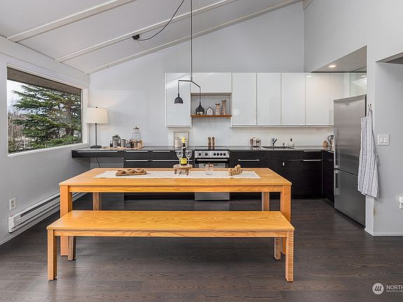 This lovely, one of a kind, top floor corner unit condo sits on the north slopes of Queen Anne w/easy access to Downtown, SLU & short walk to SPU. Enjoy peaceful views of the ship canal from your deck and from a wall of windows stretching from the dining room to the living room. This unit features vaulted ceilings and has been tastefully updated w/newer flooring & kitchen cabinets. The wood burning fireplace will keep you cozy and warm and provides a focal point for the home. Summers are cool with north facing windows. Bedroom w/double closets & vaulted ceilings. Washer & dryer included w/extra storage space in laundry room. Secure basement storage plus bonus "community storage" in unit 2. Low HOA dues in this well managed, small complex.