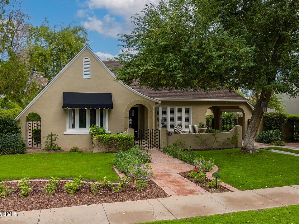 This stunning 1927 Tudor Revival nestled in the Willo Historic District exudes a perfect blend of charm and elegance, with a French-inspired flair and has been featured in Phoenix Home and Garden and the AZ Republic. The home's curb appeal is captivating, featuring a steep-pitched gable roof, an arched entry adorned with stone quoins and porte-cochère. Landscape artist Benjy Levinson designed the lush landscaping along with the quaint front patio and custom iron gates designed to echo the 1920s, which further enhance the property's charm.