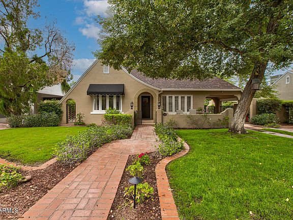 The sunny kitchen is a sweet space with gorgeous black-and-white striped wood floors, a brick-exposed wall, a vintage O'Keefe Merritt gas stove, and a charming breakfast nook. The separate family room offers a cozy retreat with a gas fireplace and seamlessly connects to an outdoor patio.