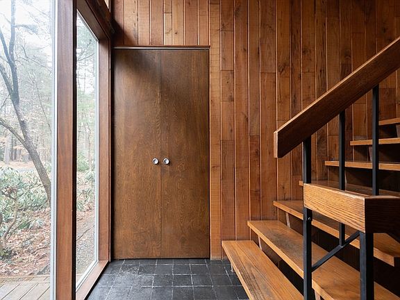 Located on a cul-de-sac in a midcentury-modern neighborhood, this striking updated post-and-beam Core Contemporary features the key hallmarks of midcentury-modern design. Skylights and floor-to-ceiling walls of windows and sliders fill the home with cheerful natural light and create an outdoor-indoor symbiosis. Thoughtfully designed, an open floor plan in the main living area and cathedral ceilings provide a sense of volume, flow, and architectural flair. The living room centers on a soaring brick fireplace. The four bedrooms are all generously sized, and the primary suite is particularly spacious, with an updated en-suite bath and a walk-in closet. The walk-out lower level has lots of room to spread out and features a second fireplace, a third full bath, and an office. Recent updates include the roof, three baths, composite decking, and some windows have been replaced. Central air and natural gas heat. Wired for FiOS.