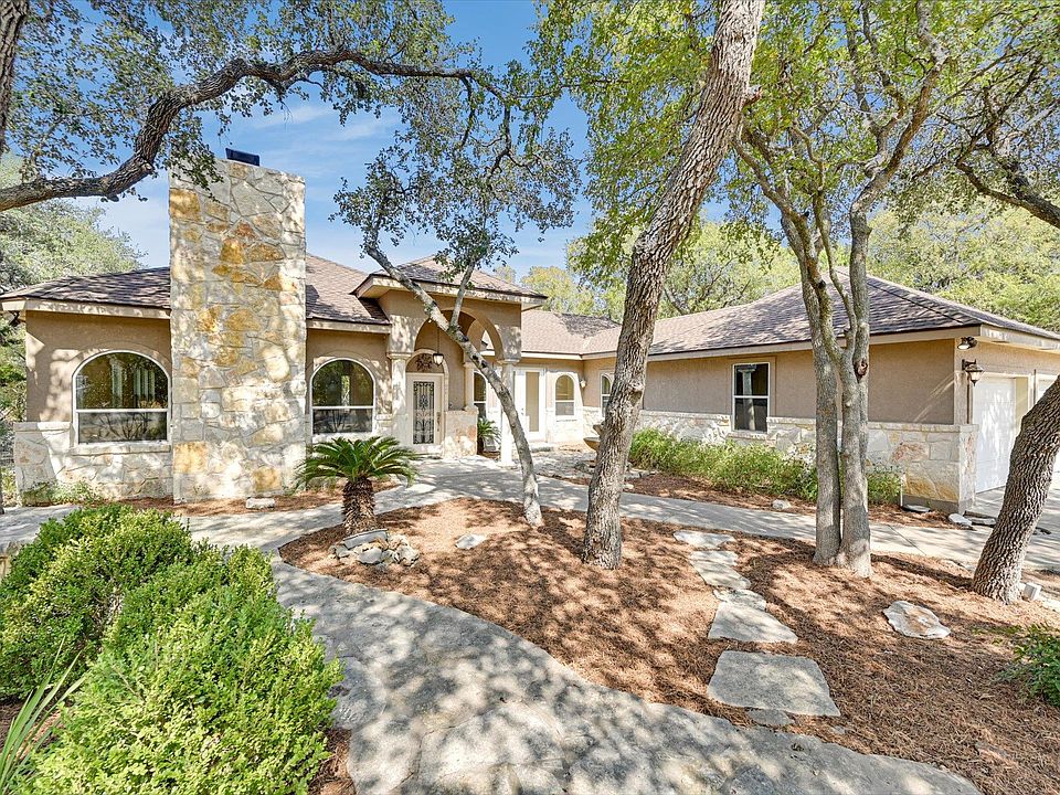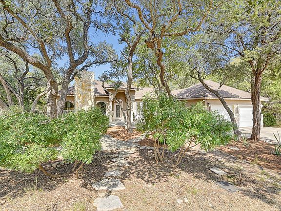 Set in a private and serene setting, this home welcomes you with a beautiful oak tree–covered front yard, inviting patio, and a covered back porch overlooking a seasonal creek and grotto. A fenced back yard area adds to the charm and functionality of this Hill Country retreat. Inside, the open-concept living and dining area flows seamlessly into the kitchen, which features granite countertops, stainless steel appliances, and a spacious walk-in pantry. A striking rock fireplace anchors the living room, while fresh interior paint (2024) brightens the entire space. This thoughtfully designed home offers three large bedrooms, each with its own ensuite bath, plus a convenient half bath for guests. The primary suite enjoys peaceful views of the backyard and includes dual walk-in closets, a double vanity, a jetted tub, and a separate shower. Other highlights include high ceilings, abundant natural light from large windows throughout, and a two-car attached garage. Recent upgrades: Roof (2025), grinder pump (2025), and disposal (2025). If you’re searching for your Hill Country dream home in the heart of the Wimberley Valley, this beautifully built residence is one you won’t want to miss!