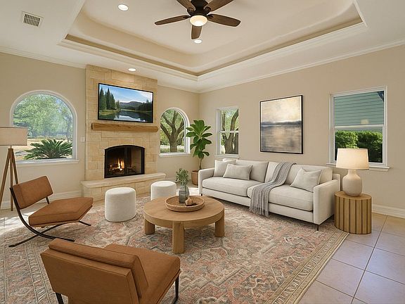 Striking rock fireplaceTwo-car attached garageFresh interior paintHigh ceilingsAbundant natural lightStainless steel appliancesInviting patio