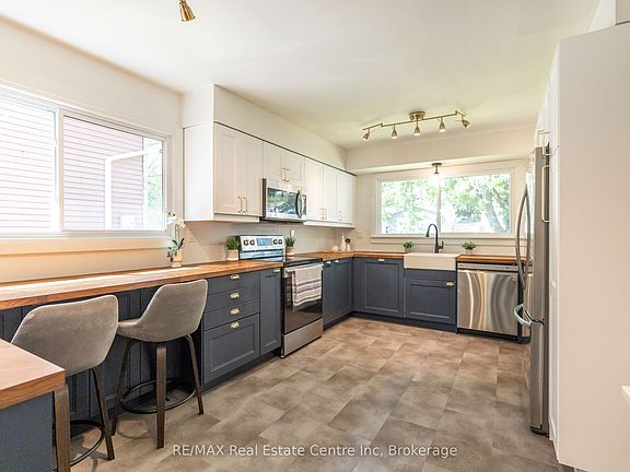 Welcome to 34 Woodridge Crescent! Tucked away in one of Guelphs well-established neighbourhoods, this charming 2-storey home offers 4bedrooms, 3 bathrooms and over 2,225 sq. ft. of living space. Just steps from shopping (Costco, Zehrs), banks, the West End Rec Centre, schools and parks. Quick access to HWY's 6, 7 & 124 makes commuting much easier. As you step inside you'll be welcomed by a spacious, fully renovated chefs kitchen, featuring ample custom cabinetry, expansive wood countertops, and a bright breakfast nook, all thoughtfully designed.Oversized windows throughout the home flood the space with natural light. The dining area flows seamlessly into a spacious living room highlighted by a cozy wood-burning fireplace, ideal for family time. A convenient side entrance provides direct access to the walk-up basement and the deck ideal for multi-generational living, teenagers or those in need of added privacy. As you go up the stairs, you'll find 3 very spacious bedrooms and a full 4-piece bathroom. The primary bedroom is exceptionally large, featuring a deep closet for ample storage. The fully finished basement features a generous Rec room, an additional bedroom/den, a 3-piece bathroom, and a large utility room that includes the laundry area. You'll enjoy relaxing and entertaining loved ones in the fully fenced backyard, which features a large main deck and a convenient side deck.As a bonus, the hot tub and two storage sheds are also included. List of upgrades: professionally renovated kitchen 2023 with luxury vinyl plank flooring (new insulation, studs, drywall and wiring), new windows by Nordik Windows 2023, shingles Nov 2019 by Platinum Roofing (50 yr transferable warranty), upstairs bath/shower & basement shower by Bath Fitter Feb 2025, new electrical panel Jan 2023, wood stove by Fergus Fireplace 2009 (triple wall pipe, fire rated wood stove tile pad) and SS appliances. One car garage and the driveway that can fit 2 cars complete this cute family home.
