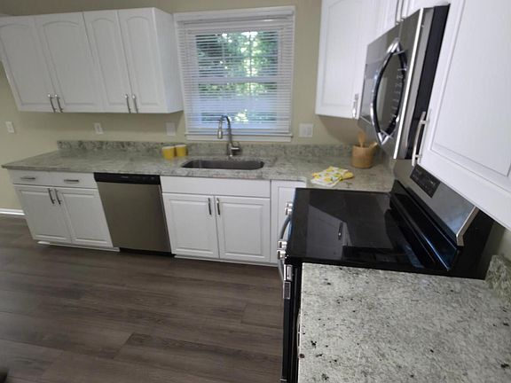 Cozy wood-burning fireplacePartial fenced yardBack deckBreakfast nookBrand-new stainless-steel appliancesGranite countertopsWooded lot