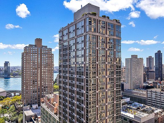 This top-floor corner one-bedroom, one-bathroom home spans 677 square feet and offers open views of the East River and downtown skyline.