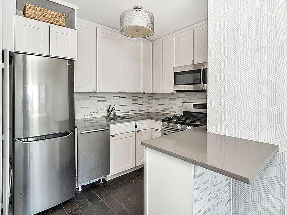 The renovated kitchen features stainless steel appliances and stone countertops. The spacious living/dining area includes built-in shelving and room for entertaining. The corner bedroom offers ample closet space and wraparound windows with eastern and southern exposures.