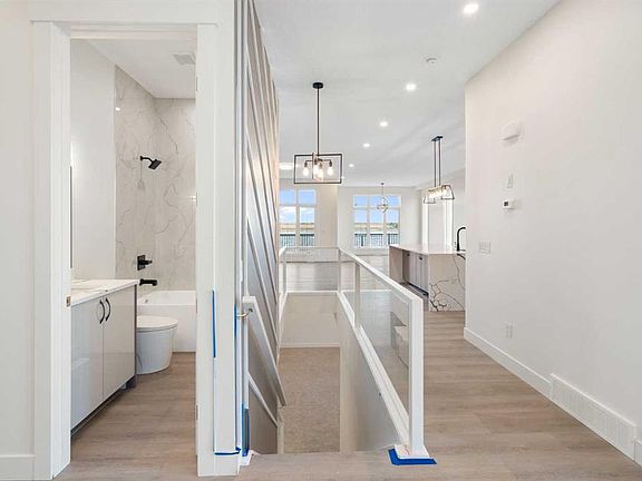 ELIGIBLE FOR FIRST HOME BUYERS GST REBATE. Welcome to Lakes of Muirfield, where elegance, space, and breathtaking views come together in this extraordinary bungalow offering more than 4,000 sq ft of beautifully finished living space. Set on a premium lot backing onto a serene pond with no neighbours behind, this home features a west-facing backyard with mountain views and a full-width covered deck topped with a stunning vaulted roof—an incredible extension of your living and entertaining space. Inside, the sprawling 2,071 sq ft main floor showcases exceptional craftsmanship, refined finishes, and thoughtful built-ins throughout. The kitchen is a standout, featuring two-tone cabinetry, an extended island with waterfall quartz countertops, stainless steel appliances, and a walk-in pantry. The open-concept layout flows into the great room, highlighted by a massive feature wall with custom built-in cabinetry, creating an impressive focal point for the entire space. The private primary suite is a true retreat, complete with a 5-piece ensuite featuring a stand-alone tub, separate tiled shower, and a huge walk-in closet with built-in drawers. Two additional main-floor bedrooms, a full bath, a spacious mudroom, and convenient main-floor laundry offer comfort and practicality for busy households. The fully finished lower level expands your living options with a large entertainment centre, wet bar, a sprawling rec room, a versatile bonus room, three more bedrooms, a full bath, and exceptional storage. With six bedrooms total and abundant closets throughout, this home easily accommodates families, multi-generational living, guests, hobbies, and home offices. An attached 3-car garage (approx. 725 sq ft) provides outstanding parking and storage for vehicles, tools, and toys. Combining luxurious indoor comfort with tranquil outdoor living, this property offers the perfect balance of privacy, space, and convenience—just minutes from city amenities. A rare opportunity in the desirable community of Lakes of Muirfield.