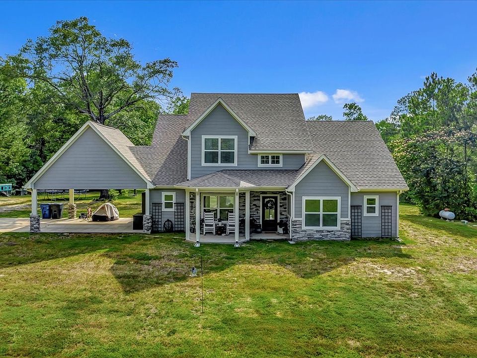 The whole package!! Quality one-owner custom home on 12 acres with open concept design. Sharp attention to detail! Formal dining room, living room with stone accent wood burning fireplace, crown molding and neutral color palette. Eat in island kitchen with pantry. 4 bedrooms and 2.5 baths plus office. First floor primary suite & office. 3 bedrooms 1 bath upstairs. Double attached carport. Covered patio overlooking the beautiful pond. Looking for peace & quiet? This is it!