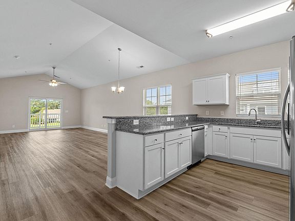 Private back balconyStainless steel appliancesCathedral ceilingsOverlooking the pondLvp flooringWhite cabinetsTray ceiling