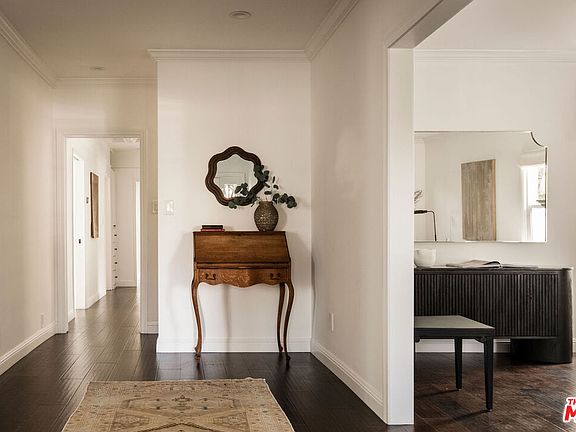 In the heart of Larchmont Village, the property consists of a 3 bed, 3 bath, 2,125 sq. ft. home plus 335 sq. ft. poolside studio with kitchenette and bathroom, offering privacy, elevated design, and effortless indoor/outdoor living. Thoughtful details abound from the chef's kitchen with premium appliances, to a serene primary suite opening to the backyard, to an additional 615 sq. ft. loft space upstairs. Designed for entertaining and everyday ease, and situated just two blocks from Larchmont's best restaurants and bars, the magical home offers a sanctuary in one of LA's most sought-after neighborhoods. A picturesque walkway canopied by an oversized front oak tree leads to the front entry, where a long foyer introduces the home's inviting layout. The living room, anchored by a gorgeous fireplace, offers a warm gathering space, while the dining room flows effortlessly into the kitchen for seamless hosting. The kitchen is both functional and stylish, centered by a honed granite island, bar seating, and ample cabinetry for home storage. Premium appliances include a Wolf range and oven, a side-by-side Sub-Zero refrigerator and freezer, a Bosch dishwasher, an LG microwave, and a wine refrigerator. The kitchen opens to a beautiful private dining patio with an outdoor heater, perfect for entertaining and dining al fresco year-round. Down the hallway, find two spacious bedrooms sharing a full bath finished with a Restoration Hardware vanity. The primary suite sits at the rear of the home, a private retreat with a spa-like bath featuring a dual-sink vanity, soaking tub, and standing shower. A back room offers a flexible space that can be used as an office or converted to a large walk-in closet with French doors opening to the side yard. Backyard living feels like a private oasis - fully fenced with a grassy lawn, patio with an electric awning, and sparkling pool and spa. A detached studio enhances the setting with its own living area, full bathroom, kitchenette featuring Bertazzoni and Fisher & Paykel appliances, plus a full-sized refrigerator and freezer. Sliding doors open directly to the pool deck, making it ideal for guests or entertaining. Upgrades throughout the residence include newer engineered hardwood flooring, a dedicated 240V outlet for EV charging at the front of the home, Nest security cameras, and a newer Carrier HVAC system with condenser and all-new ductwork. Additional highlights feature a newer tankless water heater, upgraded electrical and plumbing systems, and newer windows, doors, and sliders throughout. Just moments from Larchmont Village, the home offers easy access to endless shops and eateries, including Great White, Cookbook, Larchmont Bungalow, Larchmont Wine & Cheese, Sam's Bagels, Go Get 'Em Tiger, Jeni's Ice Cream, and more. This private and serene residence blends small-town charm with city convenience, an elevated lifestyle in one of Los Angeles' most desirable neighborhoods.