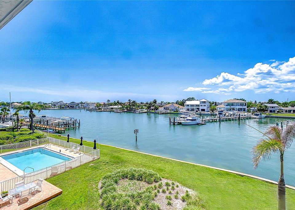 Newly Reduced Monthly Fees! Boater's Paradise! This top floor renovated condo with a panoramic view of the Grand Canal features a deep water dedicated boat slip complete with 8,500 lb. boat lift that is minutes from open water & the sugar sands beaches of St. Pete Beach. This thoughtfully designed unit with open floor plan features an updated French Country Kitchen with newer cabinetry & decorative molding opening to an expansive living room with custom lighted cabinetry. This opens seamlessly to a 32 ft. balcony overlooking high end yachts in the Grand Canal... A perfect place to enjoy morning coffee while watching the manatees & dolphins play & end your day with spectacular sunsets! This unit hosts knockdown ceilings, crown molding, 5 in. baseboards & impact windows throughout. Also included are electric hurricane shutters for added protection. Laundry Room has full size washer & dryer. HVAC & Air handler replaced in 2024. The downstairs features a recently renovated 15x16 screened cabana room with knockdown ceiling & new epoxy floor . Additionally there is a 15x16 flex room w/ knockdown ceilings. For you boating enthusiasts the boat slip is approximately 12 ft wide & 45 ft long with an electric lift that has a 8.5 ft cradle. No bridges, deep water canal with quick easy access to Gulf. This home is not just a place to live but a lifestyle to enjoy. Yacht Haven is a 16 unit complex with assigned covered parking (#304), elevator access & waterfront pool with an expansive waterfront view uncluttered by boats and boat lifts. It is minutes from Ft. De Soto Park & the world-class St Pete Beaches & easy access to Downtown St. Pete w/ its museums & vibrant nightlife. Furnishings optional.