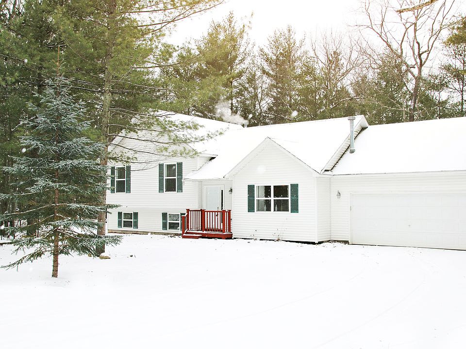 All measurements are approximate, buyer to verify. Move in Ready! Nice Home Nestled in a Beautiful Wooded 1. 26 acre Parcel Walking Distance to 700 Acres of State Land. Open Floor Plan, Stainless Steel Appliances, Gas Fireplace in Living Room, Sliding Doors off Dining Room to Spacious Deck for Great Summer Entertaining ! 3 Bedrooms/ 2 Baths, Lower Level Family Room with Walk-Out to Brick Patio. Road is maintained by the Twp.