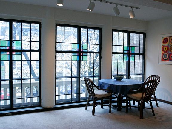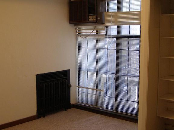 First-floor residence located in a Historic Landmark apartment building with large living and dining room, wall-to-wall carpet, wall-unit air conditioning, floor-to-ceiling windows in living room, decorative fireplace, kitchen with refrigerator and range, private storage lockers and coin-operated laundry facilities available in building. Resident is responsible for electric. Heat is included in the rent.