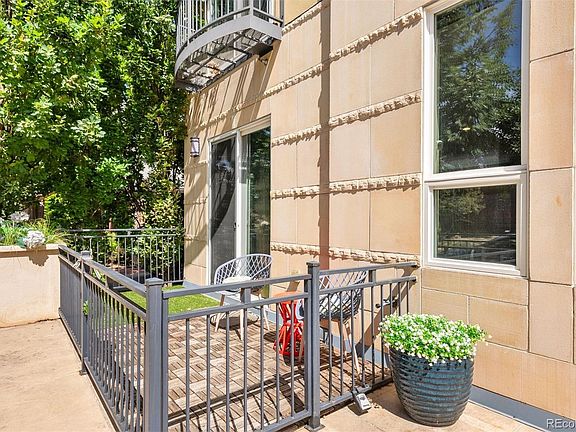 Welcome to effortless Wash Park living. This 2-bedroom, 3-bath condo spans 1,645 square feet in a desirable ground-floor end unit. Hardwood floors, soaring ceilings, and a gas fireplace set the tone, while the kitchen shines with Bosch appliances, gas range, KitchenAid refrigerator, and an eat-in bar. Both bedrooms include en-suite baths and custom closets; the primary offers dual closets—including one with a sleek barn door—and a spa-inspired bath with modern finishes and shelving. Additional features include a powder room, Hunter Douglas window coverings, and Samsung washer and dryer in-unit for convenience. Step onto your private patio and enjoy the best of indoor-outdoor living. Two assigned spaces in the underground parking garage—one oversized and located at the end of the row—are included, with garage access available by elevator from the building and by car via the alley. A private storage room literally next door to the condo adds unmatched convenience and enhances the ease of true one-floor living. The building is professionally managed and secure, with controlled entry, a video doorbell, and well-maintained common areas.