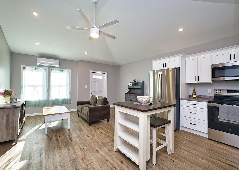 Open concept livingModern kitchenCathedral ceilingsAmple closet spaceStainless steel appliancesEv charger wiringFenced backyard