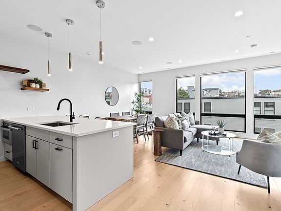 Built in 2019, this beautifully designed 2-bedroom, 2-bathroom top-floor condo offers the best of modern city living. Expansive floor-to-ceiling windows in the open-concept living area fill the home with natural light, highlighting sleek finishes and contemporary style throughout. The chef’s kitchen features quartz countertops, stainless steel appliances, an Italian Bertazzoni gas range, and a spacious island that comfortably seats four—perfect for casual dining or entertaining. Both bedrooms are generously sized with large windows and ample closet space. The primary suite includes a private bath with a glass-enclosed tile shower for a spa-like experience. Enjoy sweeping views of the Boston skyline from the shared rooftop deck—an ideal spot for relaxing or hosting friends. Additional amenities include garage parking, central air, in-unit laundry, and elevator access. This home offers unbeatable convenience—just minutes from the Seaport, highway, and vibrant restaurants & shops.