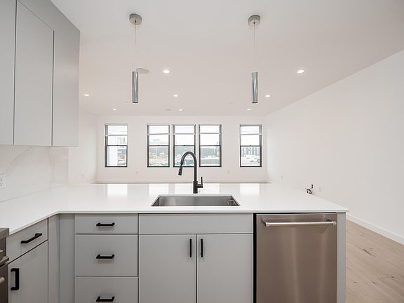 Modern metropolitan cabinetsOversized peninsulaWeathered oak hardwood floorsPolished chrome fixturesQuartz countertopsWalk-in-closet and built-insLarge windows