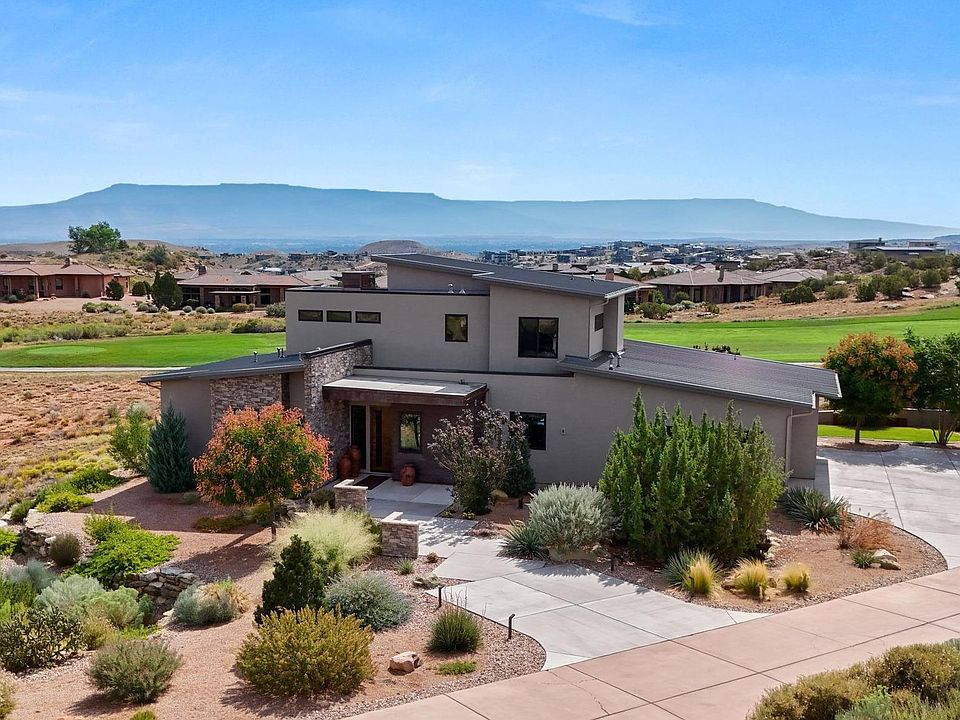 Discover an exceptional residence nestled in the sought-after Redlands Mesa neighborhood. This meticulously designed home showcases a harmonious blend of modern aesthetics and practical elegance. Upon entering, you'll find an inviting living area, adorned with rich white oak wood flooring, modern lighting, a linear fireplace and large windows, offering striking views of the Grand Mesa and the Bookcliffs. The open floor plan leads to a well-appointed dry bar with seating area and a stunning kitchen featuring quartz and leathered granite countertops, custom cabinetry and a roomy butler's pantry accentuated by sleek stainless steel surfaces. The spacious main level primary suite consists of an exquisite bathroom with a floating vanity and LED mirrors, and large walk-in closet which flows seamlessly into the laundry area providing elevated efficiency. Completing the main level is a functional office space or guest bedroom and guest bathroom. Venture up the contemporary wood floating staircase to discover a junior primary suite, an additional bedroom, bathroom and a versatile living space - all with spectacular views of the Colorado National Monument and surrounding areas. The three-car oversized garage is optimized with features like custom built-in cabinets, an adjustable slat wall, lockable area and an EV outlet making it perfect for all of your storage needs. Step outside to a beautifully landscaped yard designed for minimal upkeep, complete with mature trees and thoughtful xeriscaping. Enjoy evenings gathered around the gas fire pit and days entertaining on the east-facing patio under the custom pergola. This sophisticated home delivers complete satisfaction and is ready for you to create lasting memories in the heart of Redlands Mesa!