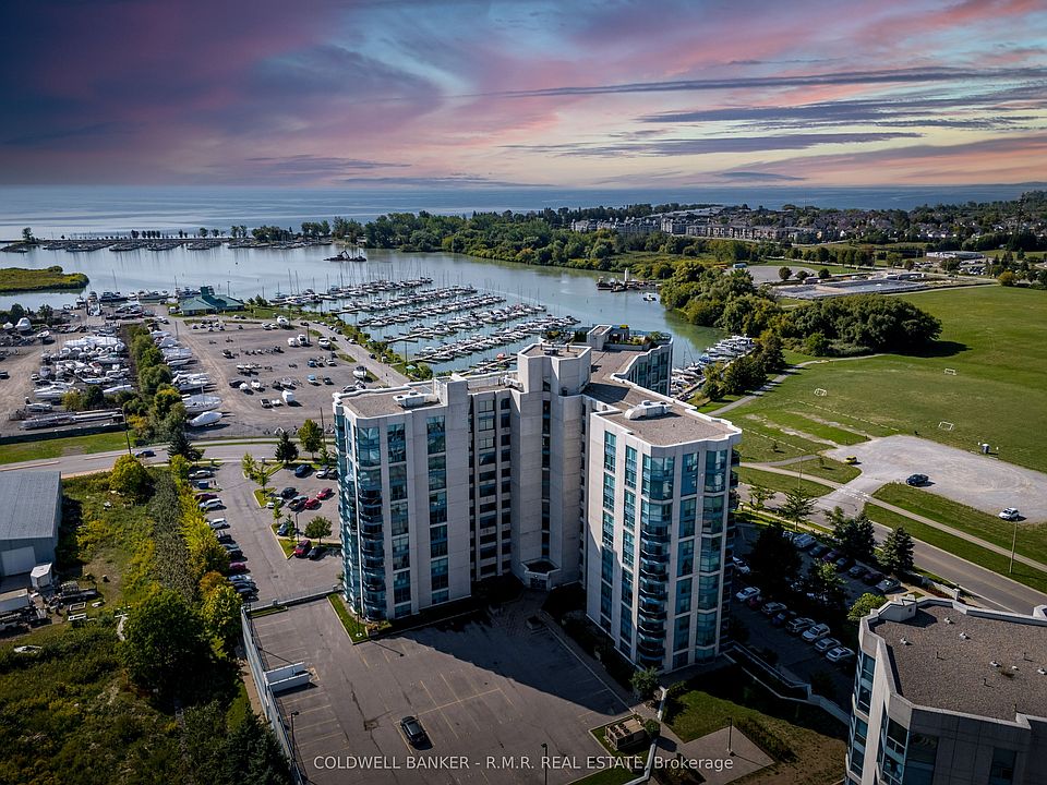 Welcome to Unit 517 at the Exclusive Yacht Club Condos, located in the heart of Whitby's vibrant waterfront community. This beautifully updated one-bedroom suite offers the perfect blend of comfort, convenience, and lifestyle, all just steps from the lake, marina, and scenic waterfront trails. The open-concept layout is filled with natural light from west-facing windows and a private balcony that captures gorgeous sunset views overlooking the city and nearby soccer fields. Inside, the space features durable laminate flooring throughout and a bright kitchen with resurfaced cabinetry and included black appliances. The spacious bedroom offers a double closet and convenient Jack-and-Jill bath access, while in-suite laundry provides everyday ease. The building offers world-class amenities, including an indoor pool, sauna, rooftop terrace with BBQ area, hot tub and fireplace, two gyms, a library, party room, and 24-hour concierge service. All utilities, high-speed internet, Ignite TV, and home phone are included in the monthly maintenance fee, making this a truly worry-free living experience. Ideally located close to the Whitby GO Station, 401, parks, restaurants, and the Abilities Centre, this condo offers exceptional value for those seeking a lakeside lifestyle with resort-style amenities.