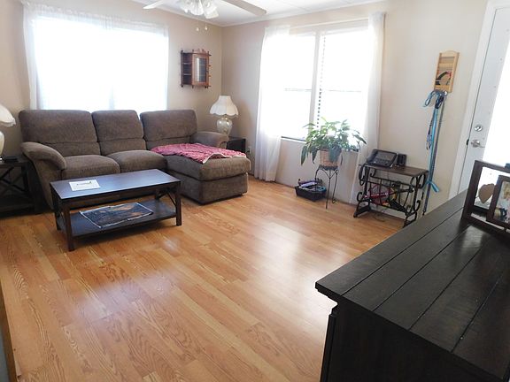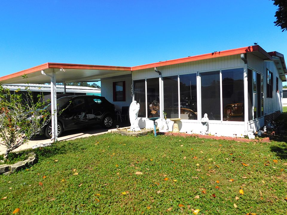 Well maintained 2 bedroom, 2 bath home offers 864 square feet of indoor living space plus accessory spaces including a 10' x 15' enclosed front lanai, a 7' x 9' back enclosed lanai, and a 7' x 9' utility shed with laundry. Home boasts laminate flooring throughout except for bathrooms which are sheet vinyl and is being offered furnished. Home feels generously spacious with a 12' x 15' living room space that is open to the dining room and flows out onto the front lanai. Kitchen is equipped with white appliances, white cabinets, and an outside facing windows above the sink. Kitchen features an open window space that communicates with the living room, and flows to the dining room openly into the dining room. The dining room is an 8' x 12' space that flows that allows access to the back lanai. The master bedroom is a secluded retreat with private ensuite bath featuring walk-in shower. The guest bedroom is situated adjacent the hallway guest bathroom which boast spacious vanity with sink. Home exterior offers a 22' x 42' carport with a patio area up front closest to the house and sits on a partially shaded lot. Air conditioner is only 3 years of age and water heater is brand new (March 2025). Located within 1/2 mile of shopping and restaurants, this home is priced to sell. Call for a showing today to make this one yours. Woodbrook Estates is an Active, pet-friendly, 55 Adult community- the monthly Fee Package includes: Land-lease and Use of all Amenities for $772. (No Additional Taxes.)