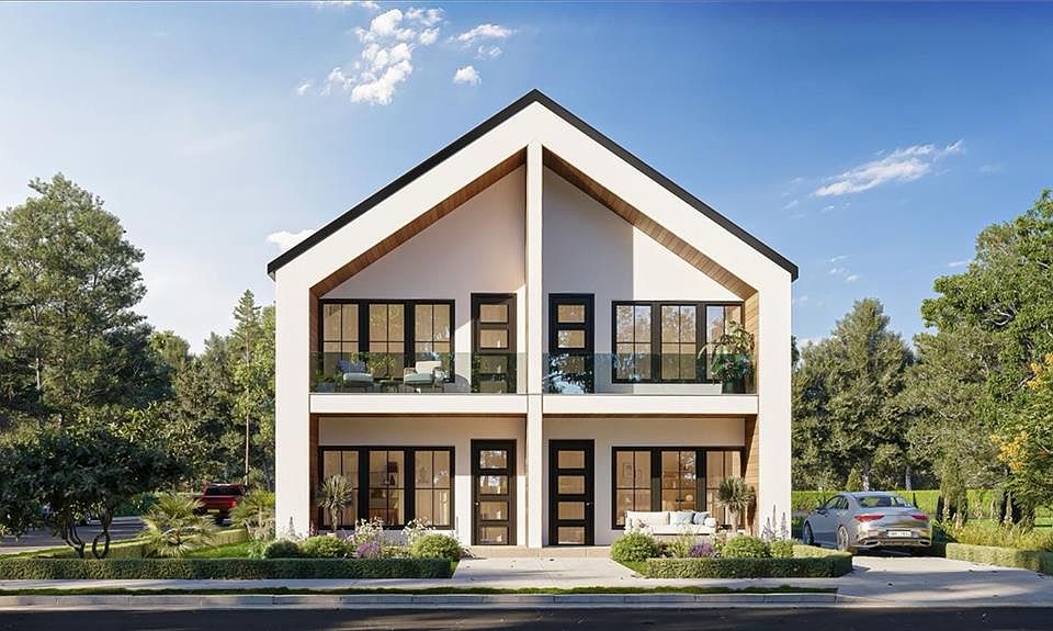 Full-size laundryOff-street parkingRear patioPendant lightingMassive primary-bedroom balconySleek glass railingsClean gable profile