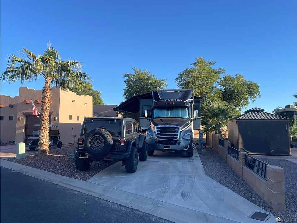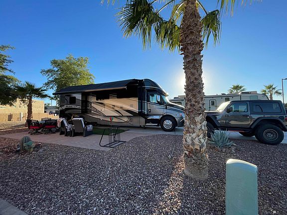 North facing move-on ready RV site offers full hook-ups & includes concrete slab for RV to park on along with paver patio area for lounging outside. Partially fenced lot with large palm tree. Utilize as-is or add gazebo, Casita, storage shed or even a villa; subject to Architectural Committee approval. Located in 55+ gated community offering seasonal planned classes, events, concerts & cafe/cabana. Pet friendly community with two fenced-in dog parks and walking path around entire perimeter of resort. A piece of paradise to come back to year after year.