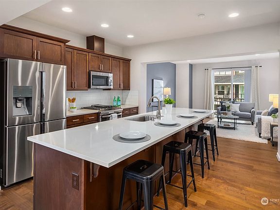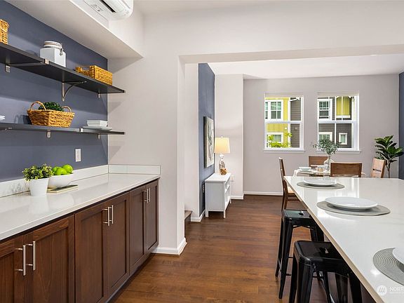 Better than new 3 bed/3.5 bath end-unit townhome with {rare} attached 2-car garage. Courtyard style entry into your picket fence front yard w/large covered front porch. Entry level has an ensuite bdrm w/full bath. Main floor features open floor plan w/hardwood floors throughout, 12' kitchen island, quartz counters, s/s appliances, gas range & ample storage. A/C in main living area + motorized custom blinds on every window. 2nd story features a primary suite, spacious 2nd bdrm (both w/custom closets), full bath, and a "tech" room. Hardwood flooring and custom blinds throughout 2nd floor also! High Point is a distinctive community with lush tree-lined streetscape and winding neighborhood streets, parks & sport courts. Great HOA, low dues.