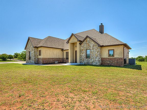 Beautiful custom built home on a 2 acre corner lot. The house includes 3 bedrooms, 2 full baths, 2 half baths, office space, large laundry room, and versatile upstairs bonus room. In the kitchen you'll find custom cabinets, granite counters, built-in gas cooktop, oven, dishwasher and microwave. The primary suite includes fireplace, soaker tub, tiled shower, double vanity sinks that lead into the walk-in closet. Step outside and you'll find a large covered back porch with fireplace, perfect for entertaining guests or relaxing with family on those warm Oklahoma summer evenings. The location gives the feel of country living with quick access to several popular local amenities. Call to schedule your showing today!
