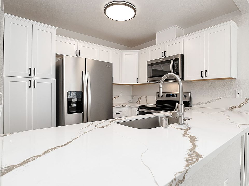 Corner fireplaceNew lighting fixturesQuartz countersUpdated bathroomTop-of-the-line appliancesBright white cabinetryStackable washer and dryer