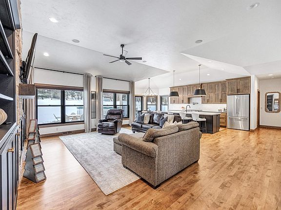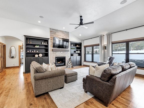 Welcome to a beautiful, spacious & updated home set on a 1+ acre lot. Open-concept, split-bed layout is highlighted by a main living area remodeled in 2024, creating a bright and inviting space. The kitchen is a true centerpiece with a large island & w/i pantry with coffee bar. The adjoining living room impresses with a floor-to-ceiling stone gas f/p & custom built-ins. 1st flr office provides a perfect work space. 1st flr laundry/mudrm has bench seating, sink, stackable washer/dryer. Primary suite boasts a private bath updated in 2021 with a standalone tub, large tiled w/i shower & granite ctops. Finished LL expands your living space with a spacious rec rm, wet bar, theater area, two bdrms & bath. More features are garage with bsmt access, irrigation system, radon mitigation, central vac.