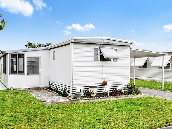 Cozy South Florida Retreat. Welcome to your perfect winter getaway! This beautifully maintained 3-bedroom, 1.5-bath home features an open floor plan, the kitchen seamlessly flows into the bright and airy living room perfect for entertaining or relaxing after a day in the sun. For additional living space, the enclosed patio with tile flooring and acrylic windows provides a cozy spot to enjoy the Florida weather year-round. The split-bedroom layout offers privacy for you and your guests. Outside is a long driveway and storage shed adding convenience and functionality. Located in a 24-hour manned gated community, enjoy access to two heated pools, a clubhouse, pickleball courts, and a full range of activities. Just 15 minutes from the beach, this well-kept home has newer windows, a newer A/C, and low monthly fees include water, sewer, internet, and lawn care. Experience the best of South Florida living, relaxed, active, and worry-free!