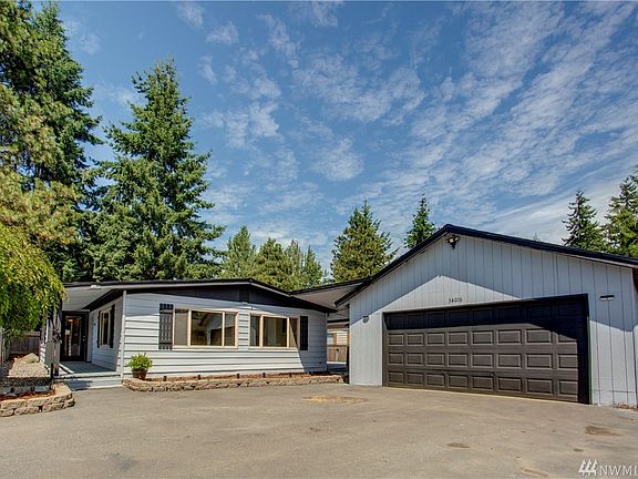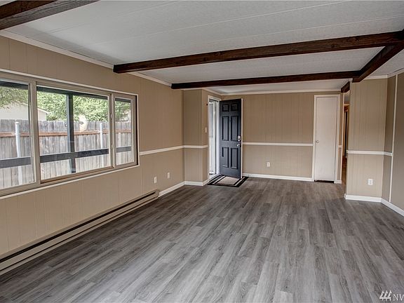 Refreshed manufactured home with new paint, floors and roof. This home is on OWNED land! No extra lease to pay with this lovely lady. Spacious single story living at over 1,300 SF. Master has an ensuite and both bathrooms have been updated. Park your RV in the driveway and still have the double car garage for vehicles or use it as a shop. Relax during the summer on the newly refurbished deck overlooking the large yard. Convenient to shopping and an easy commute to Tacoma and Seattle.