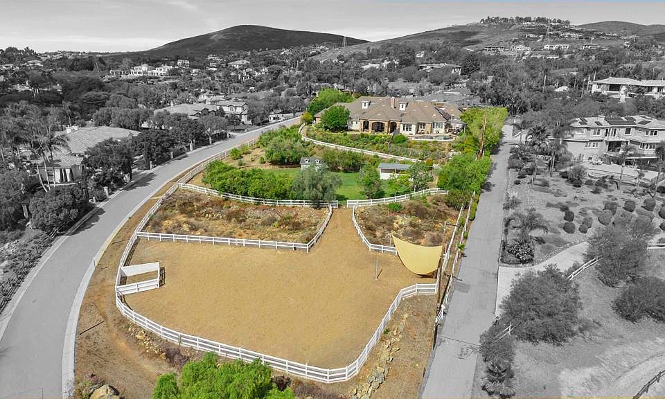 Set on nearly three acres in the rolling hills of Olivenhain, this custom single level estate blends timeless architecture with the relaxed beauty of coastal California living. Encompassing approximately 5,000 square feet, the residence offers six bedrooms and four and a half bathrooms across a light filled open concept floor plan. Expansive and inspiring views overlook the world class golf course and clubhouse of The Bridges to the south and capture distant ocean views to the west. Designed for effortless flow, the interiors feature wide plank wood floors, high ceilings, and a soothing palette that complements the natural surroundings. The great room centers on a classic brick fireplace and opens to a covered loggia framed by arched stonework, perfect for entertaining or quiet evening gatherings. The kitchen combines elegance and function with marble countertops, custom cabinetry, a walk in pantry, and a breakfast area overlooking the gardens. A formal dining room and dedicated office provide thoughtfully designed spaces for work and connection. The primary suite offers a private retreat with direct access to the patio, a freestanding tub, and dual vanities. Five additional bedrooms provide comfort and flexibility for guests or family. Outdoors, the home embraces the California lifestyle with a pool and spa, shaded dining terraces, raised vegetable gardens, and an outdoor kitchen designed for al fresco dining and year round enjoyment. The grounds extend across approximately 2.59 usable acres with manicured lawns, fruit trees, and fenced paddocks suitable for up to five horses under current Olivenhain guidelines. Set within minutes of top rated schools, scenic trails, and the beaches of Encinitas, 3401 Adams Run offers a rare blend of privacy, space, and sophistication in one of North County’s most desirable communities.