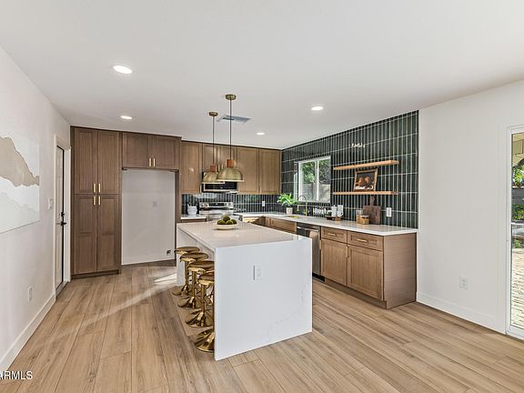 Sparkling pebble poolCovered patioInviting open layoutRaised pergolaFloating shelvesModern subway tile backsplashSs appliances