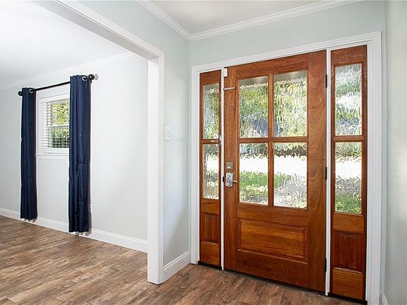 Farmhouse sinkCozy gas log fireplaceStainless steel appliancesRemodeled kitchenGranite countertopsSliding barn doorsLarge family room