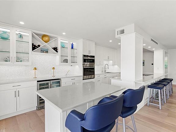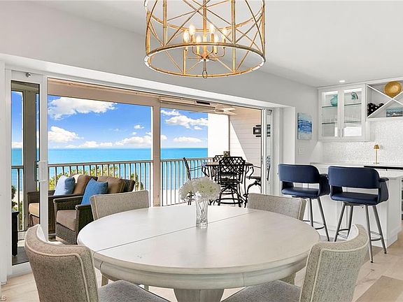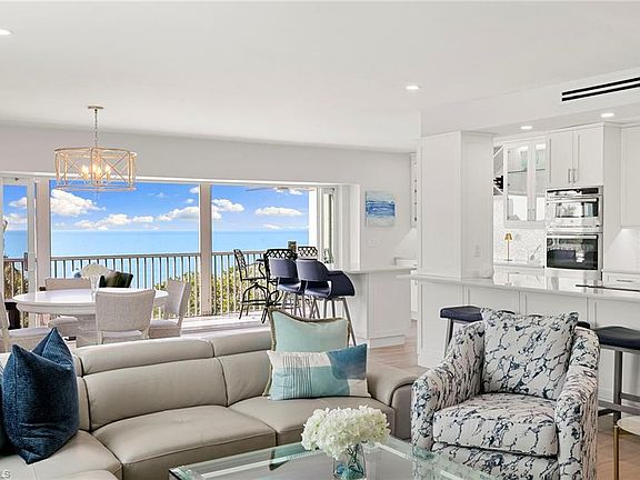 Captivating Gulf views and freshly redesigned interiors showcase a contemporary coastal design with a current open-concept floorplan. Fully renovated in 2022, this beachfront corner unit in Regency Towers is light, bright, and effortlessly inviting. The three-bedroom, three-bath layout and expansive covered screened balcony capture southwest sunlight and spectacular sunset views over the pool and beach. A reimagined kitchen anchors the great room with crisp white cabinetry, quartz countertops, island seating, GE Profile induction cooktop, wall oven, and a custom bar extension with built-in beverage fridge, seamlessly blending functionality with entertaining ease. Additional upgrades include a whole-unit water filtration system, solar-powered lanai shades, custom California Closets, and impact-rated windows and doors. The primary suite offers a serene retreat with a newly designed walk-in closet and beautifully finished bath, complemented by two generous guest rooms, each with access to a full bath. Other highlights include in-residence laundry, one under-building garage space, and private storage space. Offered furnished with few exclusions. Regency Towers is home to only 40 residences across two buildings, offering direct beach access, a newly updated beachside pool and spa, modernized social room, fitness center, grilling area, and on-site management. Ideally located along Gulf Shore Boulevard, moments from Venetian Village and minutes to downtown Naples.