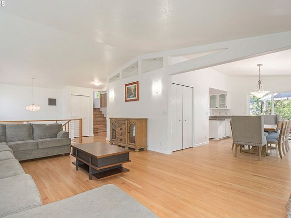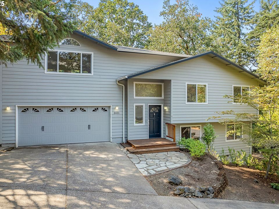 This spacious Northwest contemporary offers tremendous separation of space throughout its well-designed 2350 sq ft and wow is it peaceful! Rooms are large with high ceilings and big windows that frame Eugene and the surrounding hills -- all while preserving quiet and privacy throughout. On the main level, a huge living room with vaulted ceiling and cozy brick fireplace, spacious dining room, kitchen with granite and stainless steel appliances, and slider to a private deck in the treetops. Up a few steps is a large family room with built ins that is absolutely bathed in natural light. Down a few steps is the primary bedroom suite with walk in closet, bathroom with double sinks and private patio, plus 2 more bedrooms. The main level office could easily become a 4th bedroom. The lovely yard has low-maintenance landscaping and is fully fenced. Level driveway and 2-car garage. Newer roof, fencing, new laminate flooring on 2 levels (plus beautiful hardwood on the main). Incredibly solid and welcoming home.